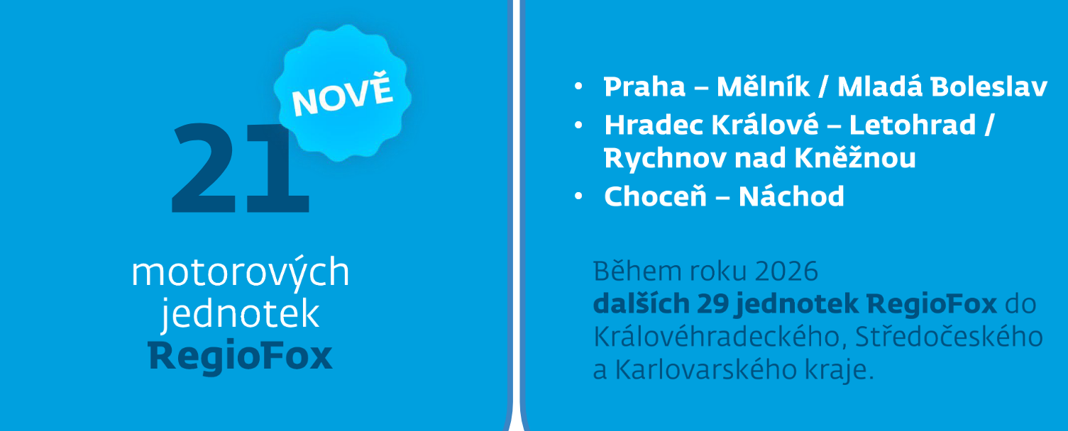 Pokračovat bude i modernizace regionálních vlaků. Letos je plánovaná dodávka dalších RegioFoxů pro Středočeský a Královéhradecký kraj, které začnou od poloviny prosince obsluhovat např. spoje na tratích z Hradce Králové do Letohradu nebo z Prahy do Mělníka a Mladé Boleslavi, kde nahradí už letité motoráky.