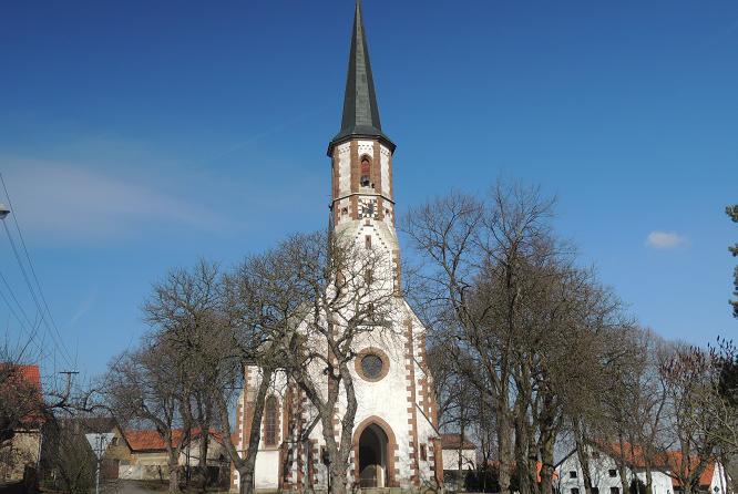 Před západním průčelím je věž s otevřenou předsíní v přízemí, věž je v dolních patrech čtyřboká, v nejvyšším patře osmiboká. Okna lodi i presbytáře mají lomené záklenky.